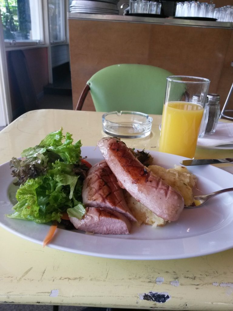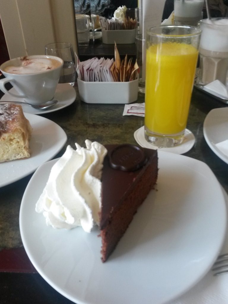 Saído dali, entrei em uma Confeitaria em uma galeria com mesas sob guarda-sois. As mesas estavam ocupadas por senhoras e senhores bem vestidos e perfumados deleitando-se com sorvetes e outros doces gelados. Então sentei e tomei um café, um suco de laranja e um apfelstrudel com creme de baunilha. Custaram 15 euros e não era nada especial. Comparado ao Apfelstrudel de Salzburg, este era menos que regular.